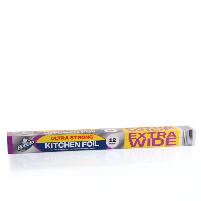 Introducing Buffalo Ultra Strong Kitchen Foil: a robust, 12m aluminum foil that is extra thick and wide, ideal for all your cooking, baking, and food storage tasks in the oven, fridge, or freezer.