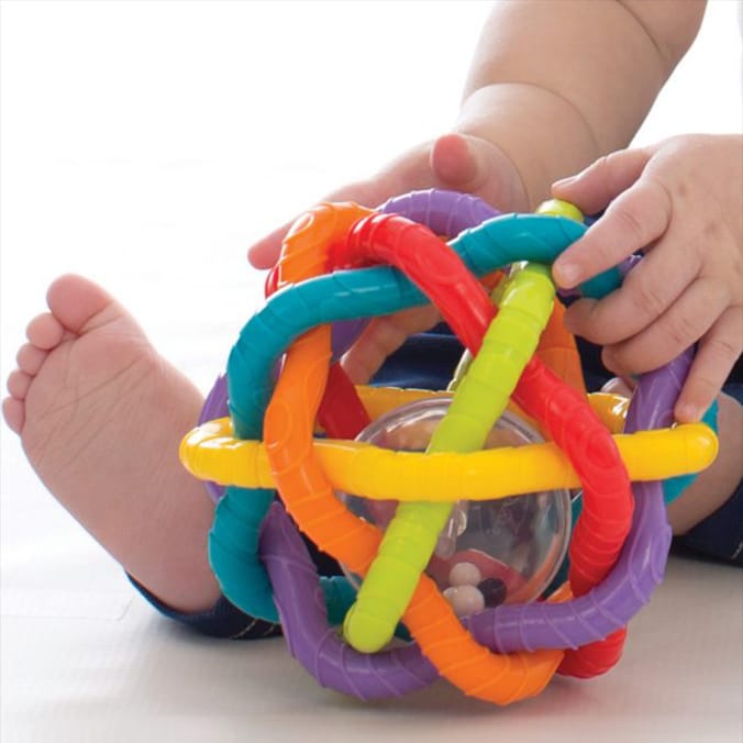 Tumble and bend! The Bendy Ball is a playtime toy sure to entertain busy little babies on the move. Textured surfaces will encourage fine motor skills through sensory play and gross motor skills will be assisted as baby throws and crawls after it. The rattle inside will delight baby as the Bendy Ball tumbles across the floor. A great baby shower gift, this baby ball is sure to become a favourite.