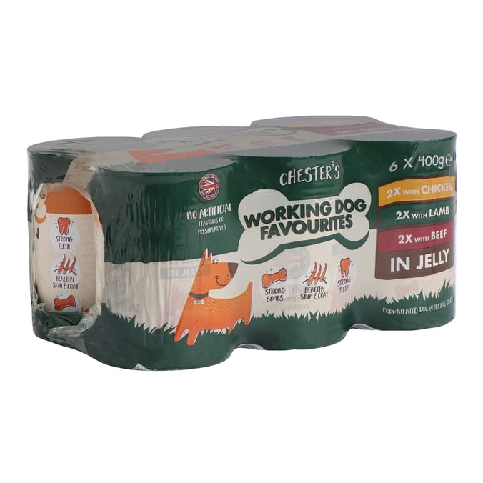 Chester's Working Dog Chunks in Jelly Food Tins is made with fresh meat recipes in jelly to provide your dog with a complete and balanced meal and all the vitamins and minerals needed to keep your dog's tails wagging.